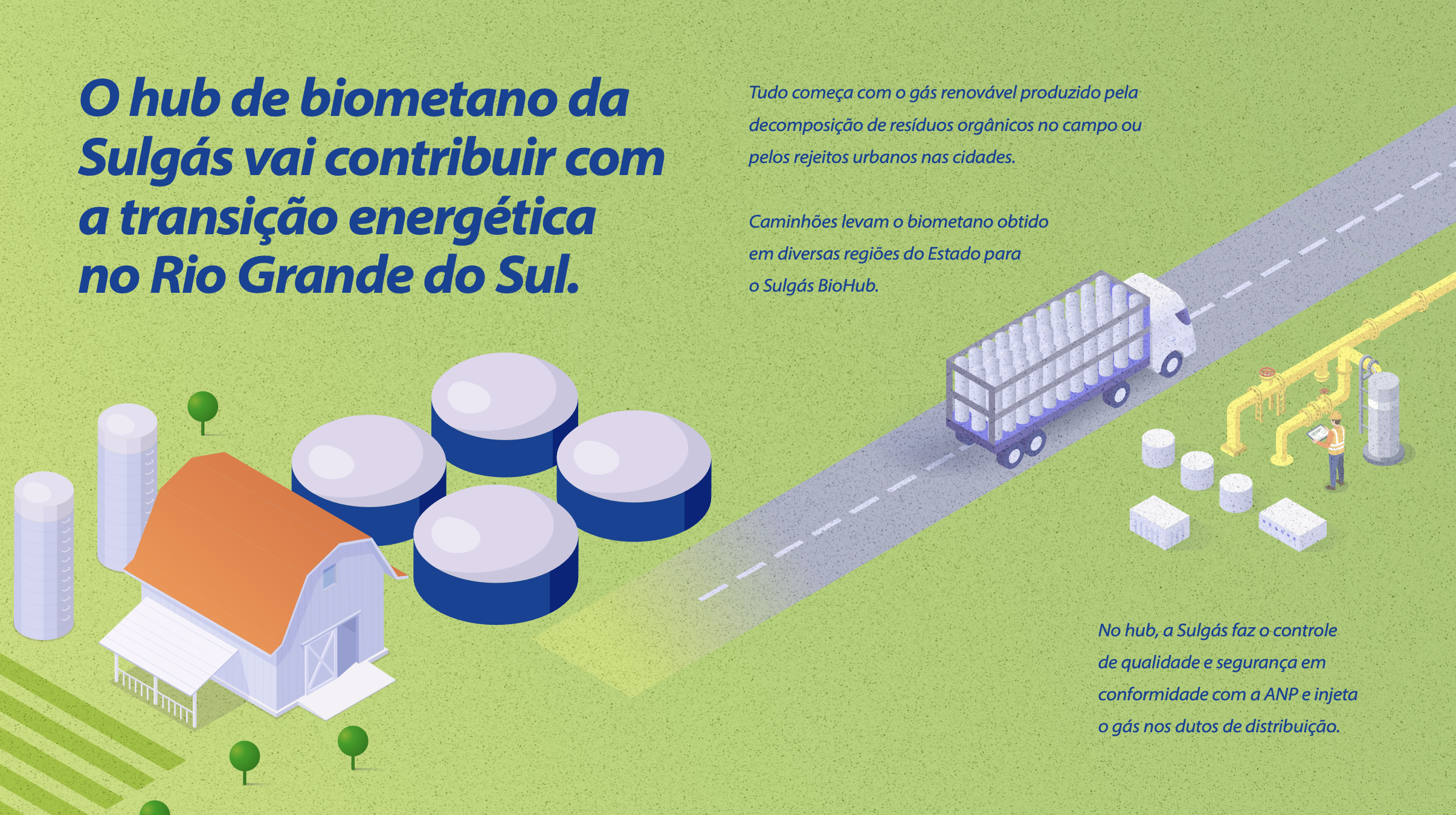 O hub inaugura um novo modelo de distribuição no Rio Grande do Sul. O gás comprimido será transportado dos produtores até uma estrutura, que será instalada em Esteio, na Região Metropolitana. Ali, passará por etapas essenciais antes de seguir para distribuição: descompressão, controle de qualidade e medição certificada. Esse processo garante que o biometano atenda às especificações técnicas e regulatórias, permitindo sua injeção no sistema de gás canalizado com a mesma segurança e qualidade do gás natural já utilizado pelos clientes da companhia.